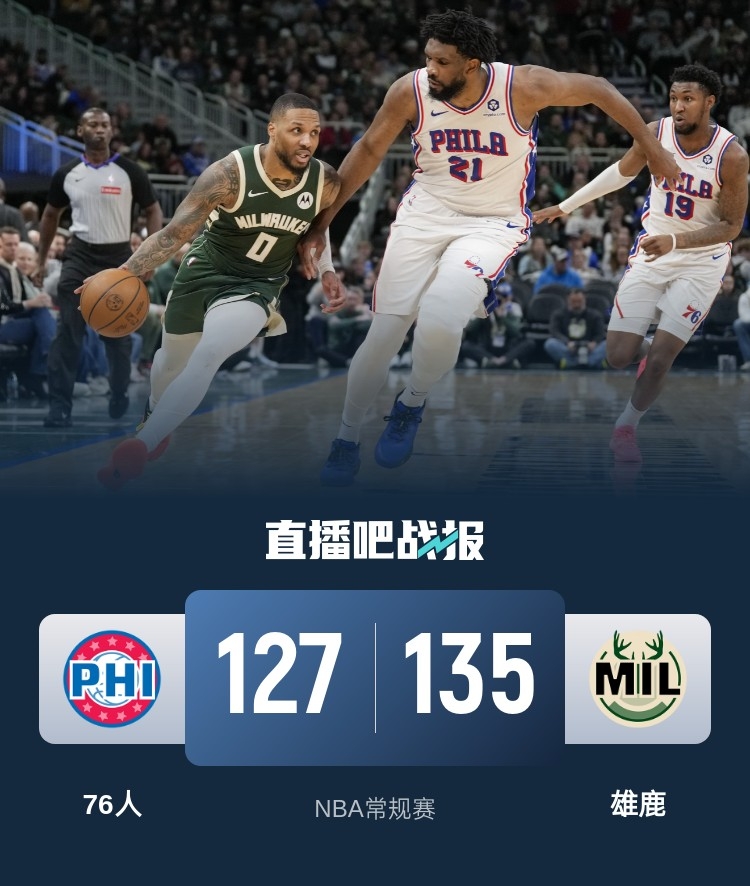 比赛开始,双方开场大打对攻,恩比德连投带罚拿到15分,利拉德得分助攻一肩挑,马克西单节也轰下20分,次节双方命中率骤降,但比分始终紧咬,半场战罢雄鹿65-63领先76人。易边再战,雄鹿外线开火,连中三分将分差拉开到两位数,末节更是一波15-2将分差拉开到25分,76人苦苦追赶无奈之前挖坑太大。最终,残阵雄鹿主场135-127击退完全体76人。