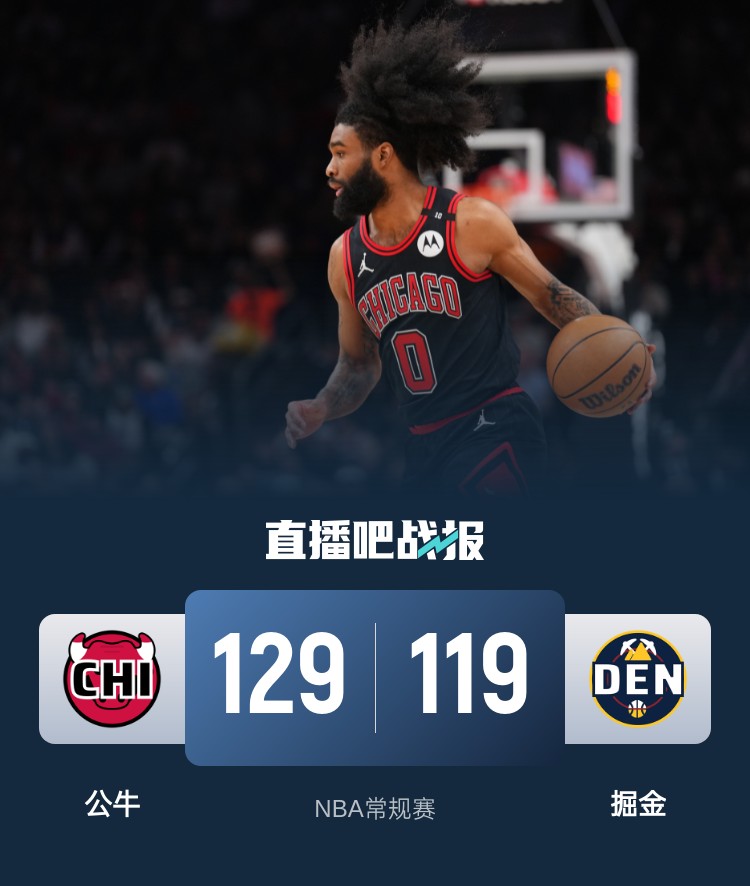 首节之争双方前半段状态相当一路拉锯,不过掘金在顶住对手的攻势后逐渐占据上风,他们凭借一波8-0的攻势拉开比分占据上风;次节公牛不断反击,怀特延续近期状态第二节5投全中拿下15分,上半场10投8中的他帮助公牛在最后时刻追平比分进入下半场。休息归来双方持续拉锯最大分差不过6分,但也很快被抹掉。末节决胜怀特站出来连拿7分帮助球队从落后实现反超,末段特里、杰伦-史密斯和基迪联手轰进5记三分,公牛凭借这波攻势拉开两位数领先奠定胜局。最终,公牛客场击败掘金迎来3连胜。