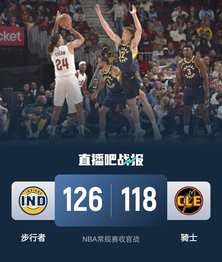 上半场,贾勒特-阿伦开场出手不中后下场,完成自己本赛季的全勤,双方势均力敌,比分交替领先,次节骑士火力全开,连续命中三分,泰森手感火热帮助球队不断扩大优势,半场战罢骑士61-44领先步行者。下半场,骑士持续发力一举将分差拉开到27分,步行者内外开花苦苦支撑,末节骑士突然哑火,步行者大举反击一度追到只差1分,骑士内外开花稳住局势,步行者抢断反击扳平比分,将比赛拖入加时。加时赛两队依旧打得难解难分,关键时刻双方各中一球,再度进入加时。加时赛,步行者内外开花确立优势,骑士苦苦追赶无果。最终,步行者126-118双加时逆转骑士。