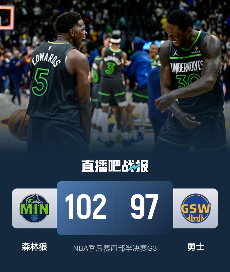 5月11日讯 NBA季后赛西部半决赛G3,森林狼今日去到客场对阵勇士,双方前两战战至1-1平,此役库里继续缺战,爱德华兹伤势无碍继续首发。