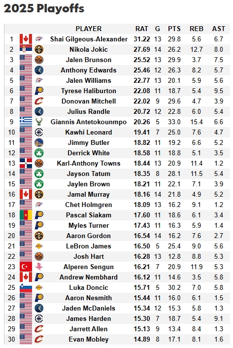 05月23日讯 今日媒体HoopsHype更新了季后赛全球评分(Global Rating),具体情况如下: