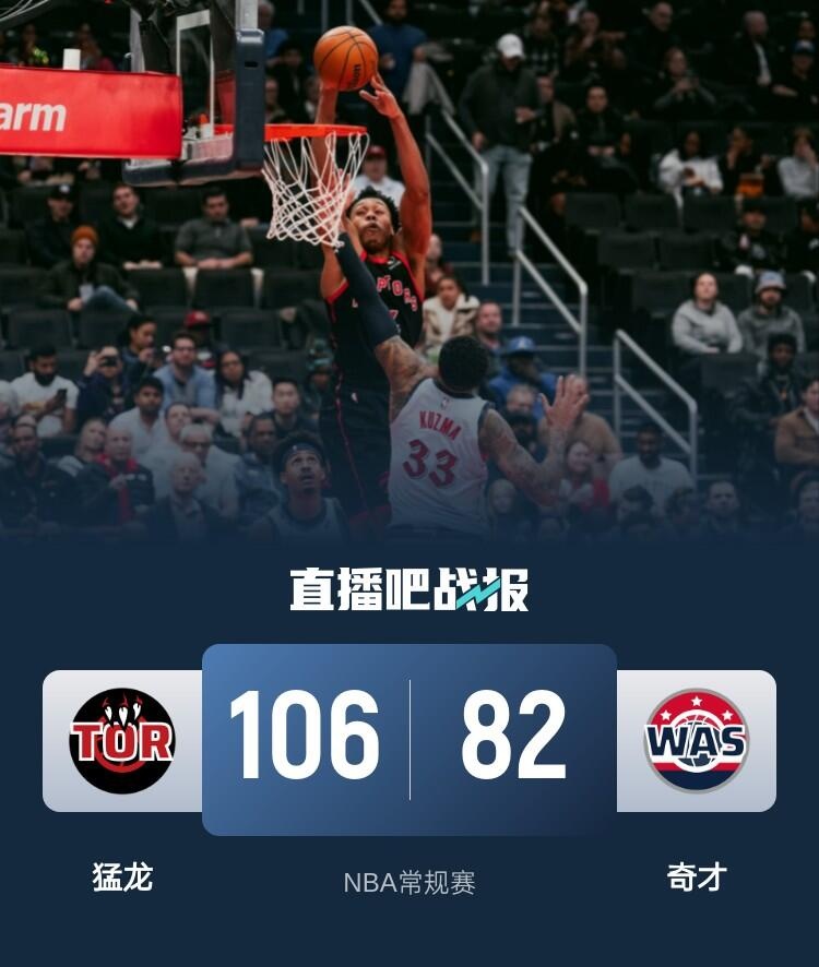 开场后奇才失误不断,猛龙以14-0开局,瓦兰丘纳斯篮下连续补篮打进为奇才打破5分钟得分荒,随后奇才逐渐找到手感但场上分差一直在两位数。第二节上来奇才依旧失误不断,猛龙多点开花将分差拉大,库兹马连续打进为奇才止血,但随后奇才又是连续进攻不中,猛龙在巴恩斯和巴雷特带领下将分差拉大到23分。易边再战,奇才进攻依旧打得十分混乱,库兹马虽然偶有扣篮的高光表现但是无力带动球队打出反扑,猛龙始终将分差保持在20分以上,最后一节又是沦为垃圾时间,最终猛龙106-82大胜奇才取得5连胜,奇才遭遇15连败。
