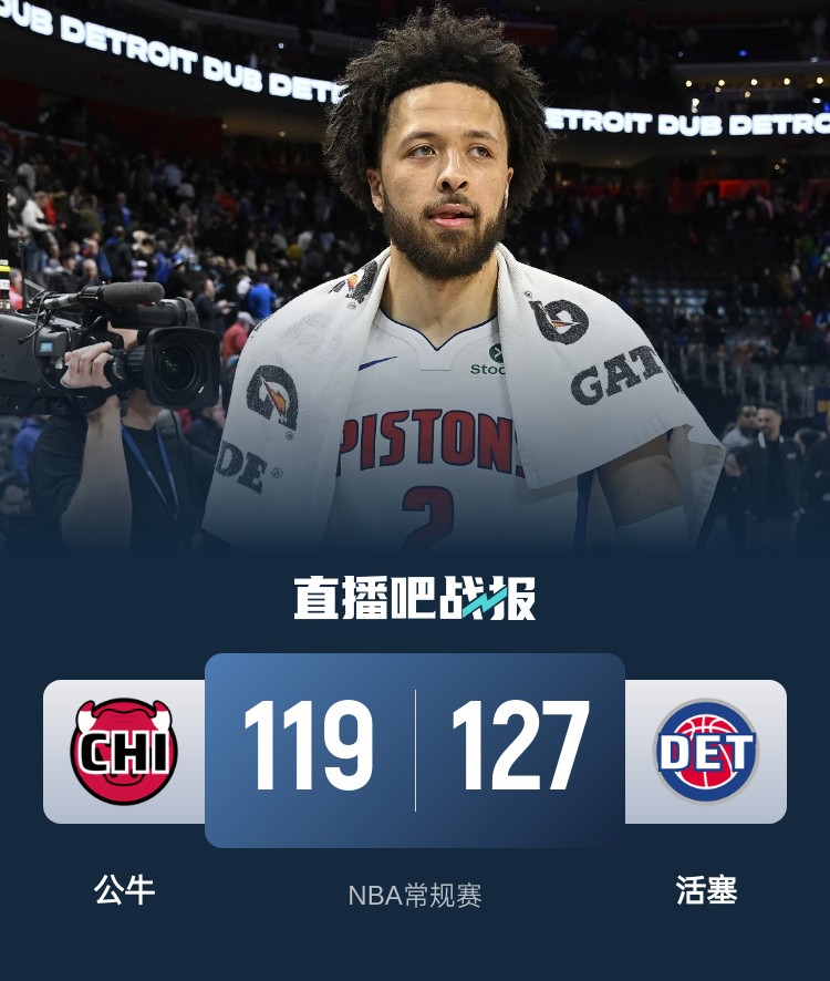 比赛开始,公牛反客为主打出8-2开局,哈里斯联手康宁汉姆站出来止血,随后双方对攻,公牛外线多点开花首节建立5分领先,次节丰泰基奥里突外投连砍9分,活塞打出进攻波直接反超比分,随后活塞继续多点开花半场领先到10分。下半场,公牛上来连中4记三分迅速追到差2分,但活塞全民皆兵连续攻击内线强势回应稳住优势,康宁汉姆有攻有传带领活塞三节还领先9分,末节比斯利接连三分轰出8-0,但怀特接连三分回应8-0,随后双方围绕10分左右分差展开拉锯战,最终活塞127-119力克公牛。