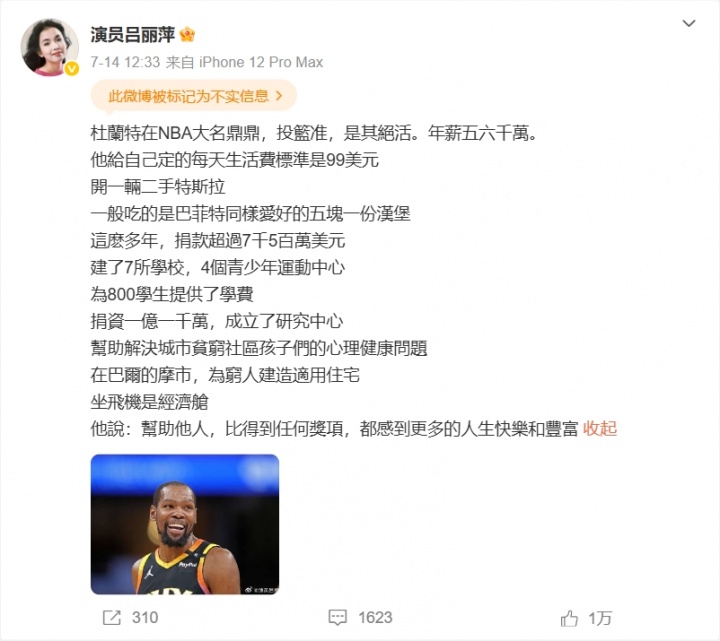 07月18日讯 中国内地女演员吕丽萍昨日发文分享了NBA球星杜兰特的故事,却被微博官方标记为不实信息。