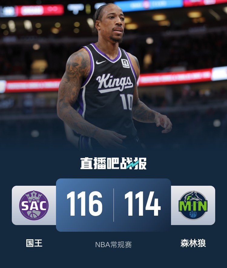 一开场,双方大打对攻,里德连中三分,穆雷高效发挥给出回应,次节国王延续火力,德罗赞得分助攻一肩挑率队一度获得两位数分差,爱德华兹状态不佳,半场战罢国王67-59领先森林狼。下半场,德罗赞单节拿到12分,但森林狼多点开花缩小分差,末节双方争夺陷入白热化,国王稳扎稳打保持微弱优势,关键时刻国王挑战成功获得球权,萨博尼斯罚球杀死比赛。最终,国王116-114力克森林狼,客场过关。
