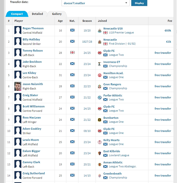因为,他们曾长期以业余球队身份参加苏格兰联赛,阵中没有任何职业球员,非常传奇。所以,他们的德转历史售出球员页面是非常特别的(图3),几乎都是自由转会,球队收不到任何转会费,好球员会被职业队直接签走。