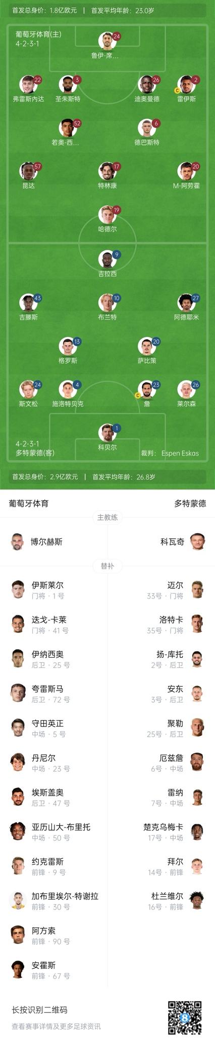 葡体首发:24-鲁伊-席尔瓦、2-雷斯、3-圣朱斯特、6-德巴斯特、17-特林康、19-哈德、20-马克西米利亚诺-阿劳霍、22-弗雷斯内达、26-迪奥曼德、52-西莫斯、57-昆达