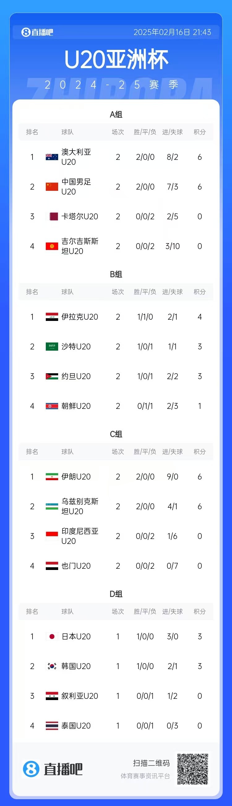 小组赛末轮,伊拉克将对阵约旦,沙特则对阵朝鲜。A组方面,U20国足将对阵澳大利亚U20,卡塔尔U20对阵吉尔吉斯斯坦U20。