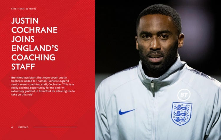 2月26日讯 布伦特福德官网消息,俱乐部一线队助理教练贾斯汀-科克伦加入图赫尔的英格兰男足一线队教练组。科克伦将继续担任布伦特福德一线队助理教练,他自2022年7月以来一直担任这一职位,将以双重身份担任这两个角色。