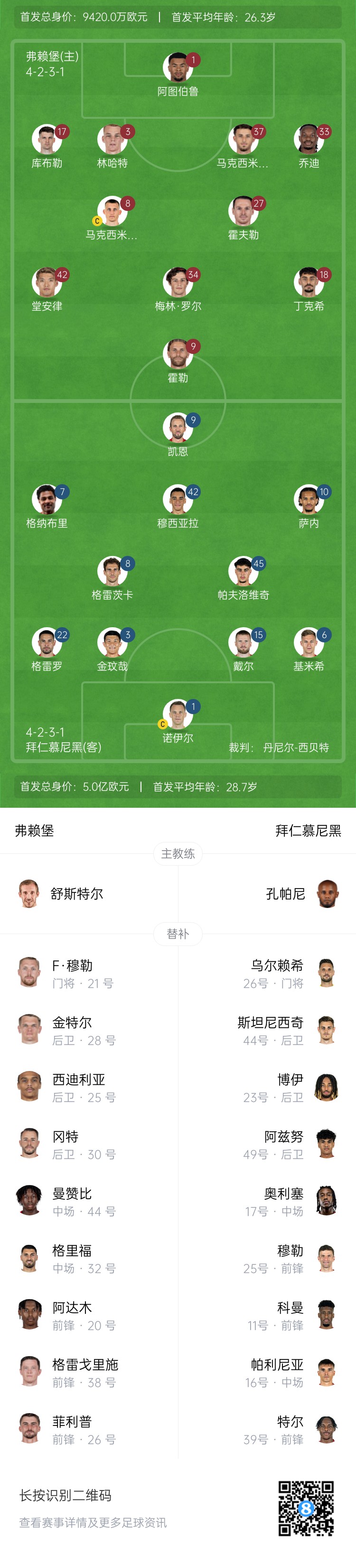 弗赖堡首发:1-阿图博卢、3-林哈特、17-库布勒、33-马肯戈、37-罗森菲德、8-埃格施泰因、27-霍夫勒、34-梅林-罗尔、42-堂安律、9-霍勒、18-丁克奇