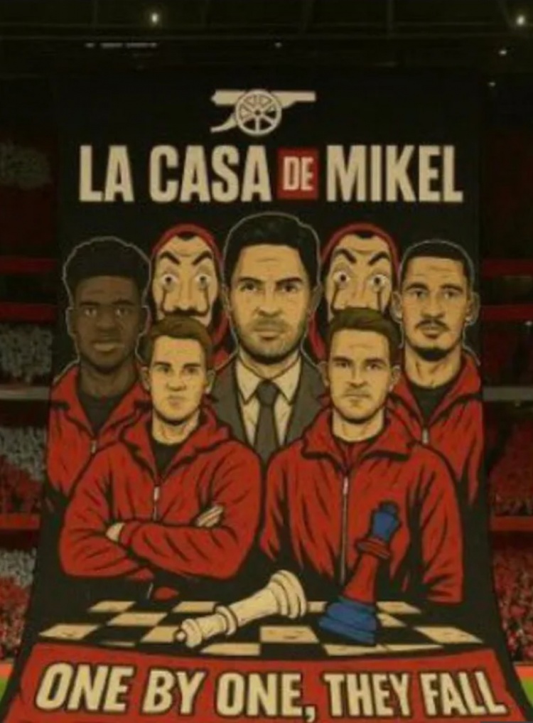 这些设计灵感来源于热门Netflix剧集《纸钞屋》(La Casa de Papel),其中两款tifo将标题改为“米克尔之家”(La Casa de Mikel)。另外两款设计中包含棋盘元素,其中一条信息写着“他们一个个倒下”,而另一款则没有任何文字。棋盘元素似乎是参考了皇马球迷在上周伯纳乌四分之一决赛次回合比赛前展示的横幅。