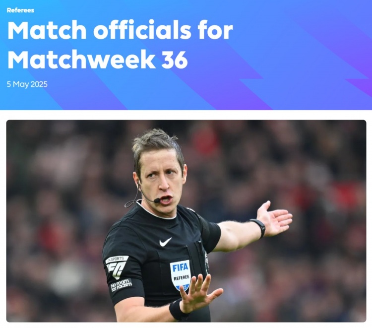英超第36轮裁判: