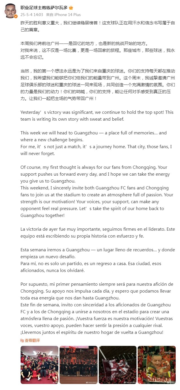 5月4日讯 在中甲联赛第7轮的首个比赛日中,重庆铜梁龙2-1战胜定南赣联,并继续稳坐积分榜榜首的位置。赛后铜梁龙主教练萨尔瓦多更新微博,并谈到接下来要前往广州的旅程。