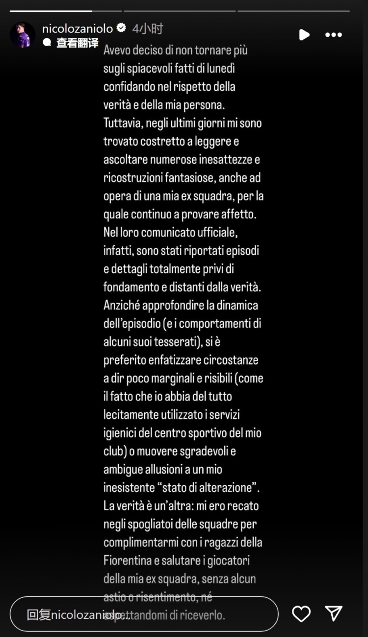 事实是另一回事——我前往球队更衣室是为了向佛罗伦萨的队员们表示祝贺,并与前俱乐部的球员们打招呼,没有任何敌意或怨恨,也没料到会受到这样的对待。”