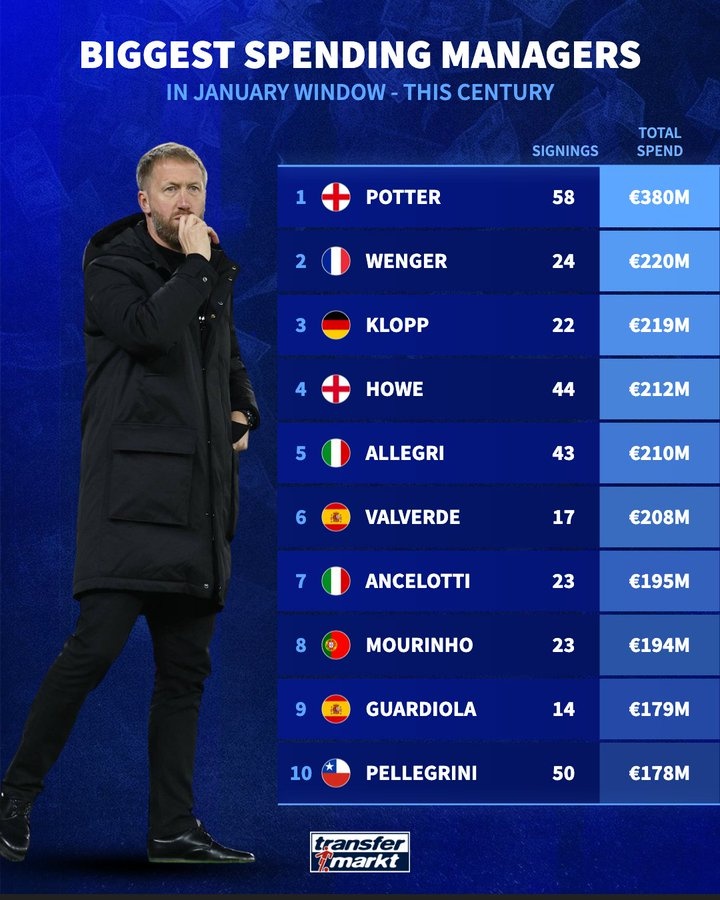 1月16日讯 德国转会市场盘点了21世纪足球主教练的冬窗引援数量,西汉姆主帅波特一共在冬窗签下过58名球员,总花费3.8亿欧元,两项数据都断层领先。