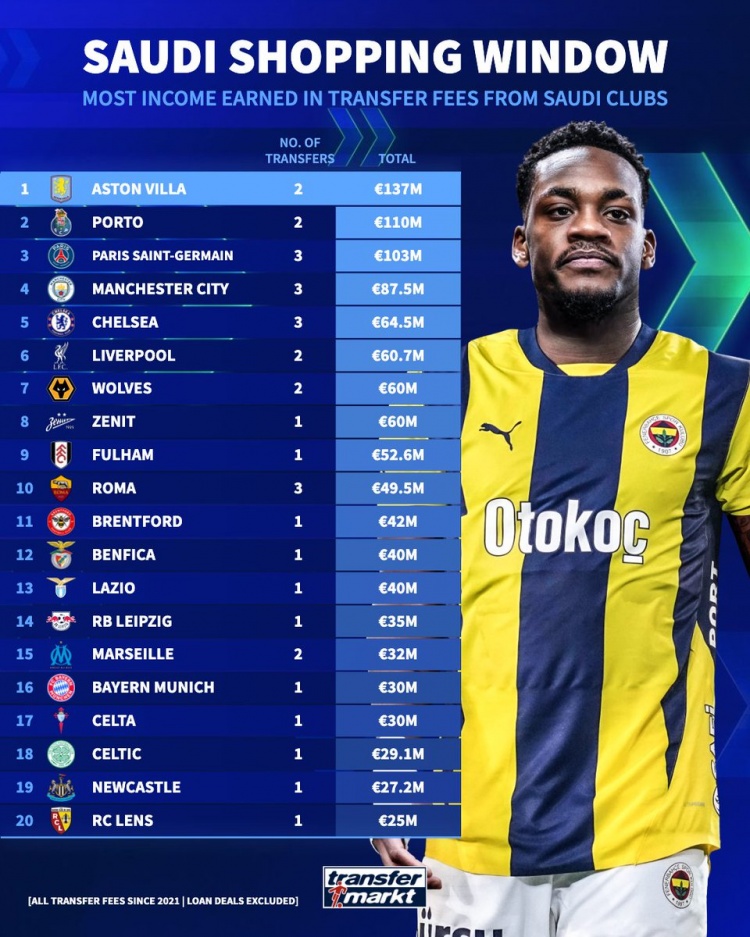 7月9日讯 德转统计各俱乐部向沙特球队卖人收入,维拉以1.37亿欧居首,波尔图1.1亿欧第二,巴黎1.03亿欧第三。